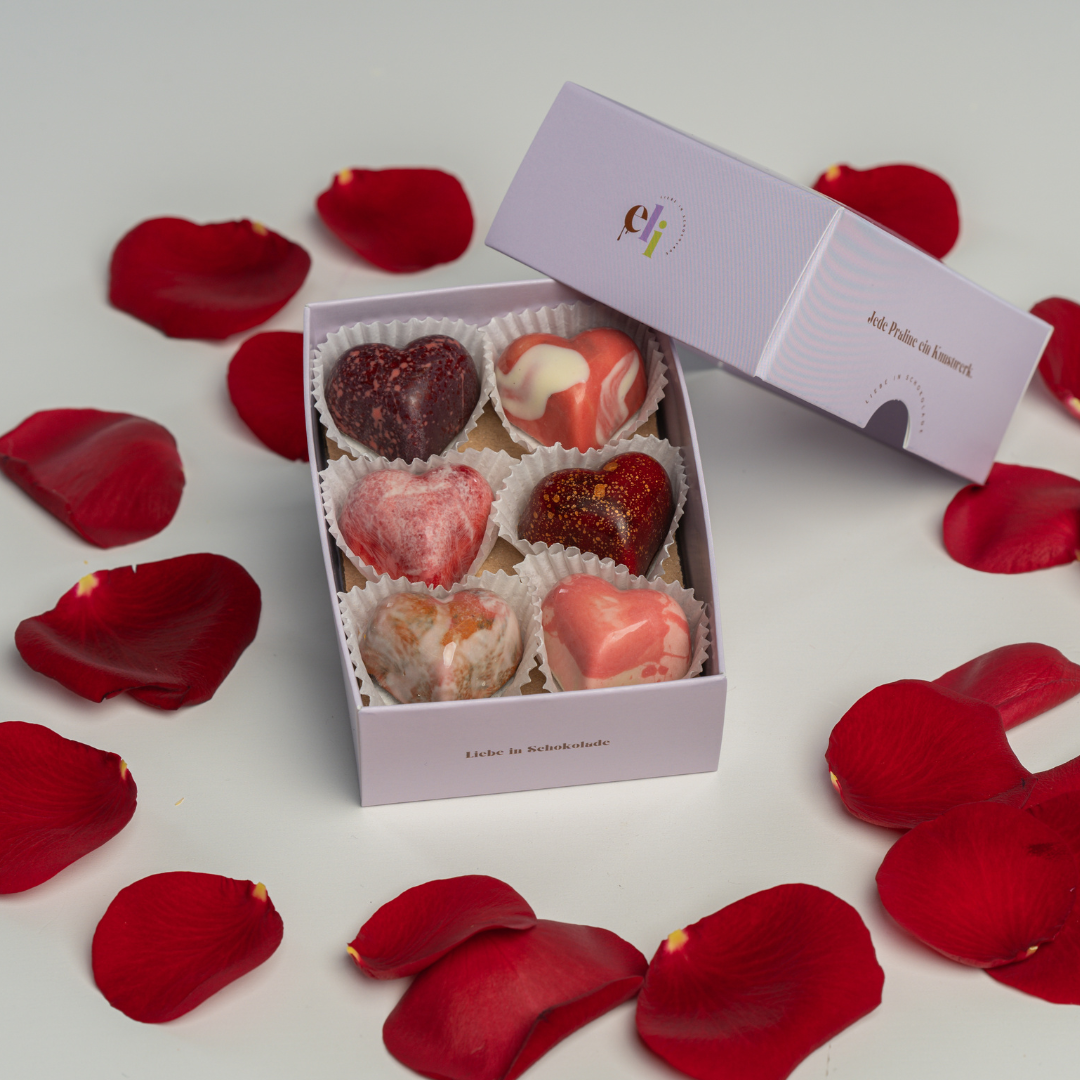 Diese Herzpralinen sind die perfekte Liebeserklärung an deinen Lieblingsmenschen. Denn Liebe geht bekanntlich durch den Magen und genau das Versprühen diese einzigartigen Herzpralinen. Von nussig über fruchtig, von weißer bis dunkler Schokolade, wunderbar für einen romantischen Abend mit deinem Lieblingsmenschen.